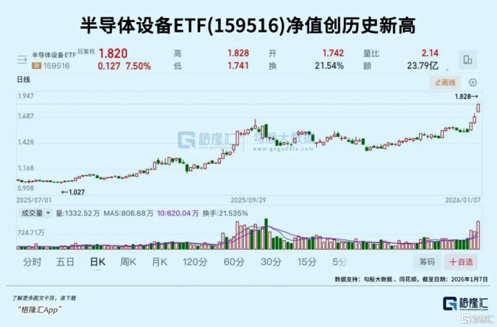 聚焦上游卡脖子环节的半导体设备ETF(159516)标的指数涨7.33%,2026年三个交易日飙涨18.12%,带动该ETF净值创历史新高。