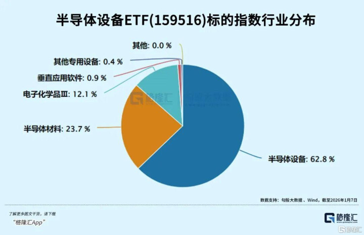 而跟踪中证半导体材料设备主题指数的半导体设备ETF(159516),聚焦产业链上游,指数中半导体设备含量62.8%,半导体材料含量23.7%,合计权重占比超86.5%。